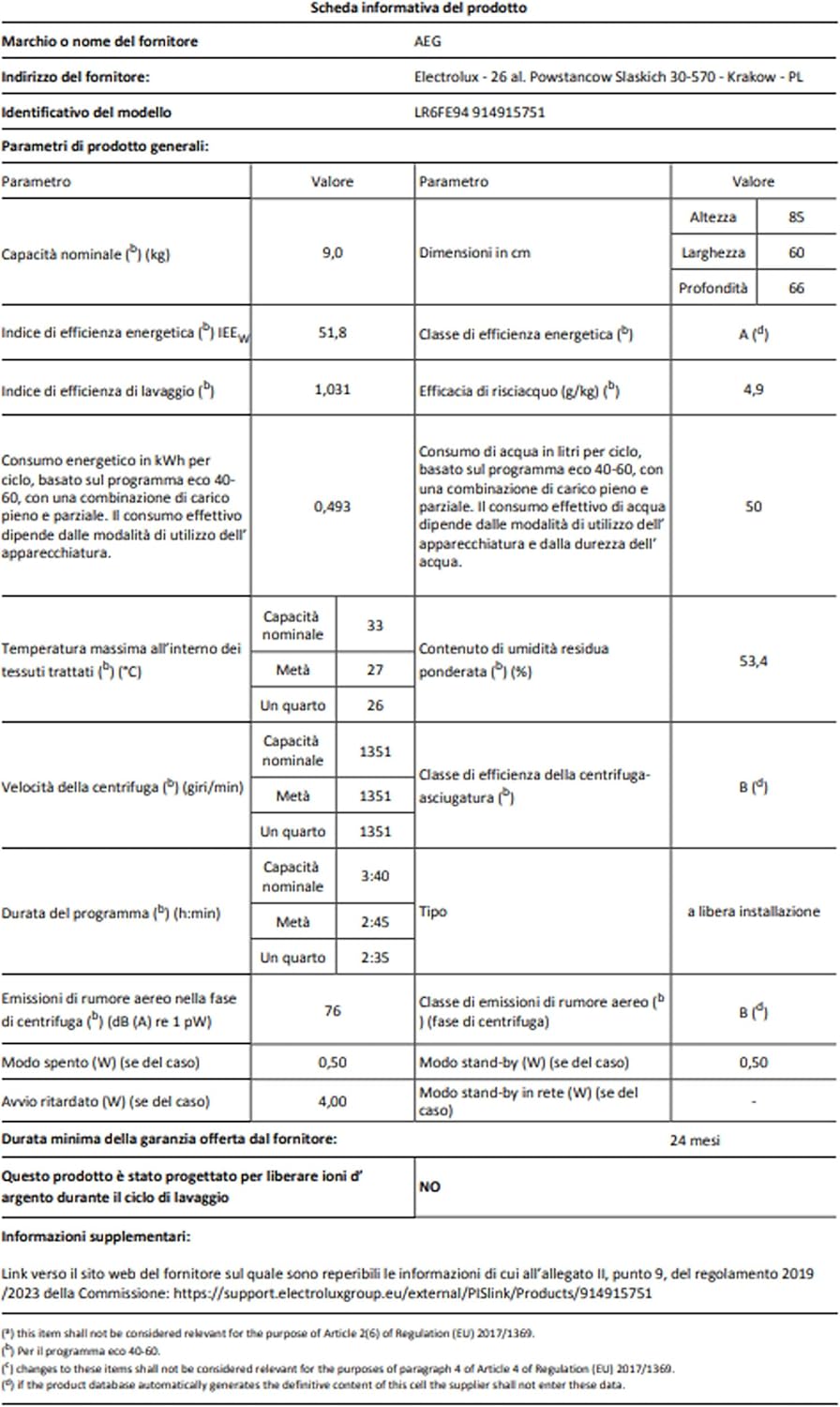 Lavatrice AEG LR6FG94 - cm. 60 - capacità 9 kg - bianco