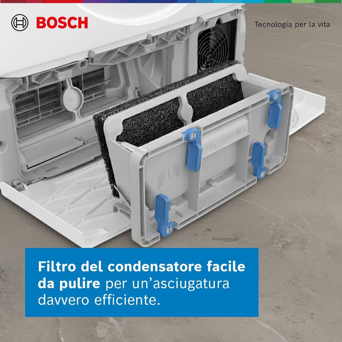 Le asciugatrici a pompa di calore con Condensatore autopulente proteggono i tuoi capi e mantengono un'alta efficienza energetica. Il condensatore si pulisce automaticamente fino a quattro volte durante il processo di asciugatura, mantenendo il massimo rendimento energetico, ciclo dopo ciclo. Le asciugatrici a pompa di calore Bosch sono progettate per funzionare in modo efficiente e asciugare i vestiti delicatamente e alla perfezione.