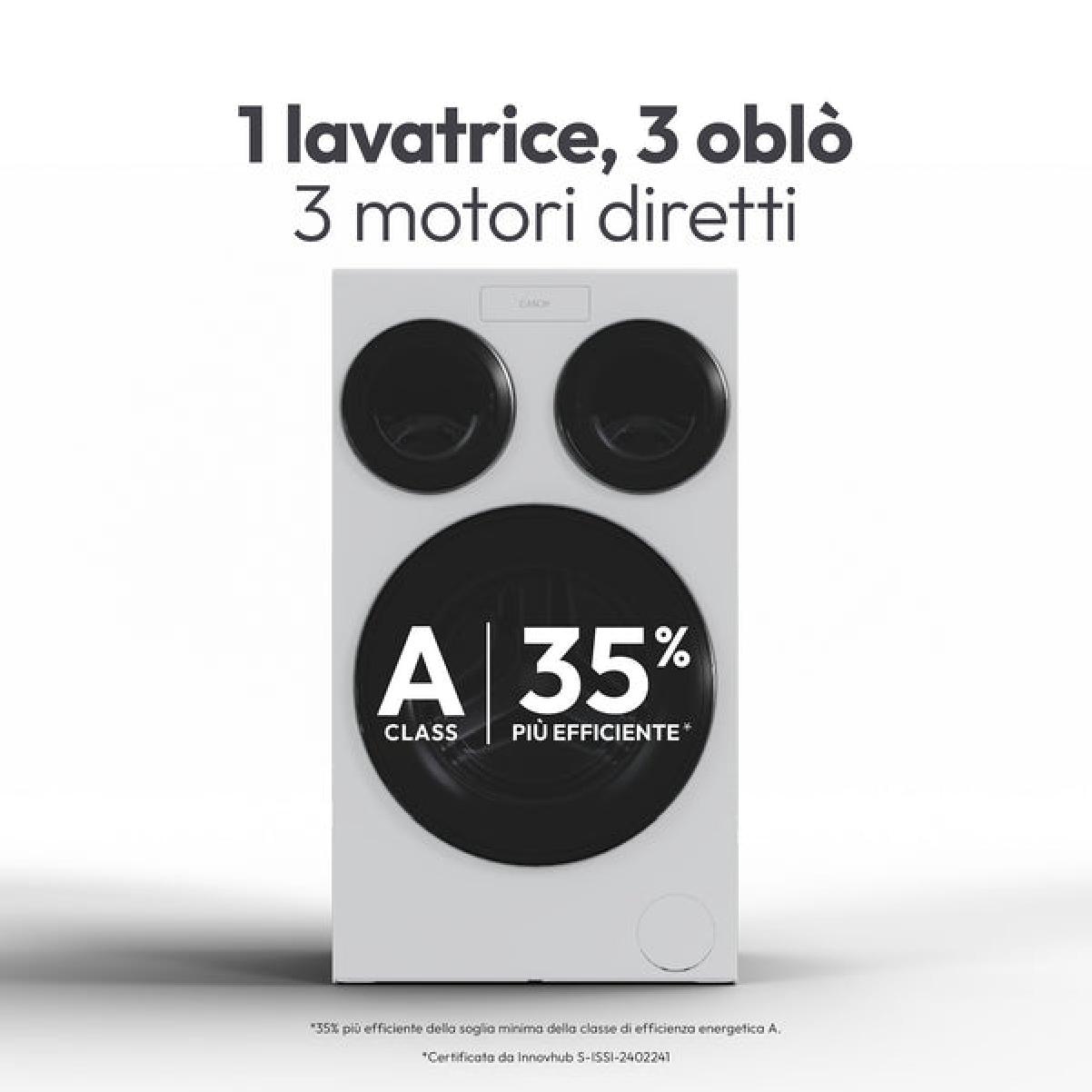 La prima lavatrice Candy con tre motori diretti: ogni oblò ha il suo motore diretto, senza cinghia. Il risultato è un controllo più preciso, meno vibrazioni e una maggiore affidabilità nel tempo