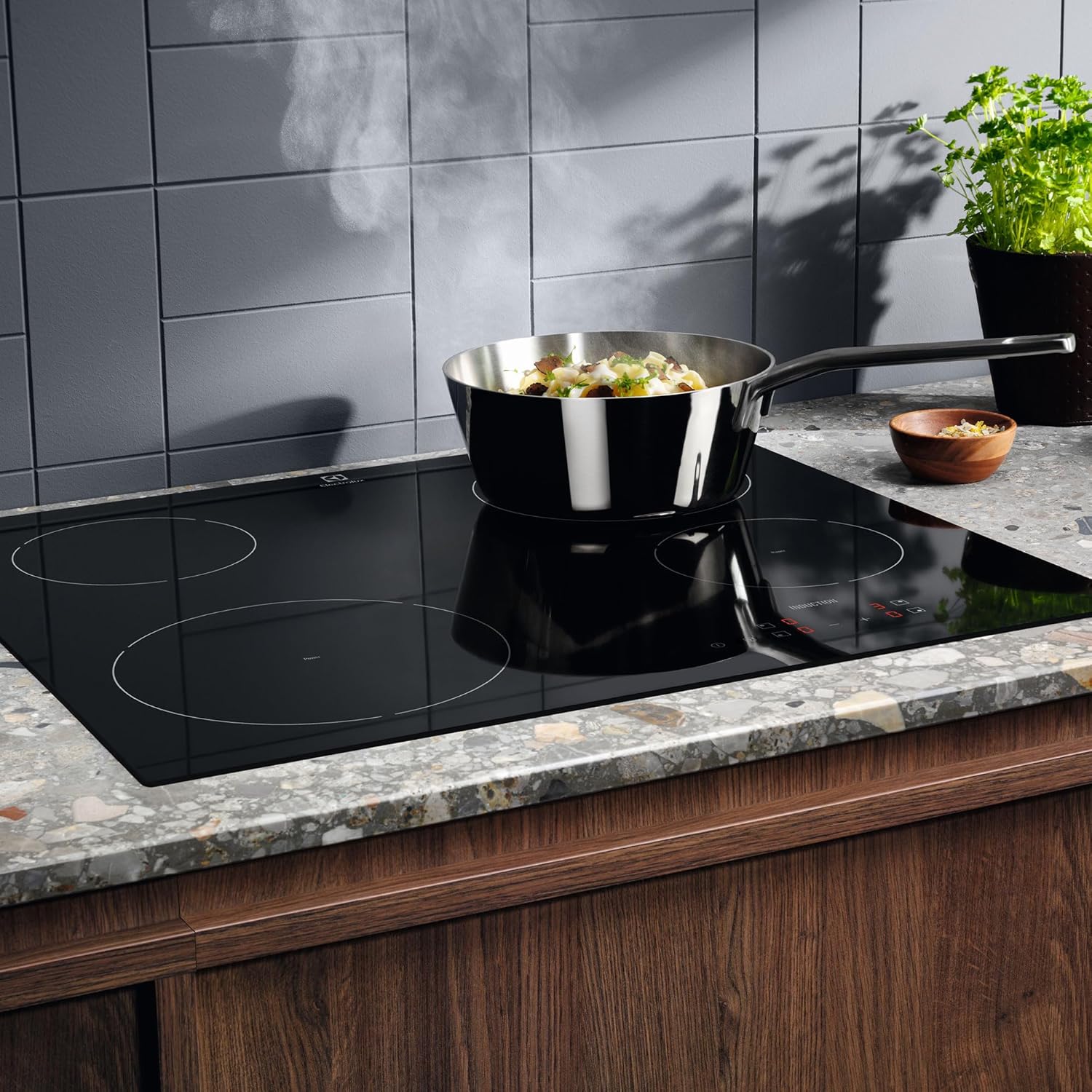 La technologie à induction signifie que la chaleur est délivrée rapidement et précisément au bon endroit, tandis que les zones environnantes restent fraîches et sûres. De plus, il réagit immédiatement aux changements de température. Et la surface lisse est super facile à nettoyer.