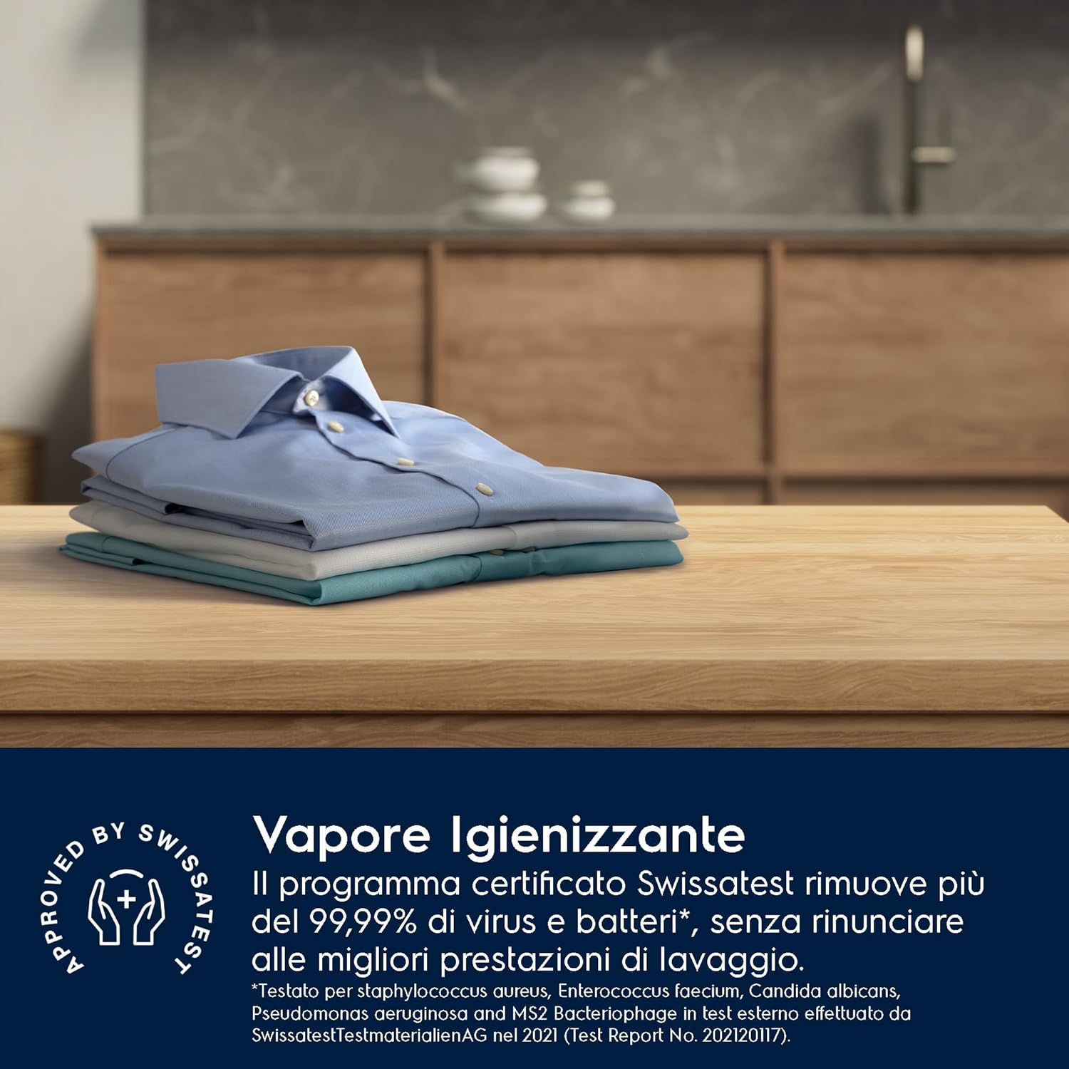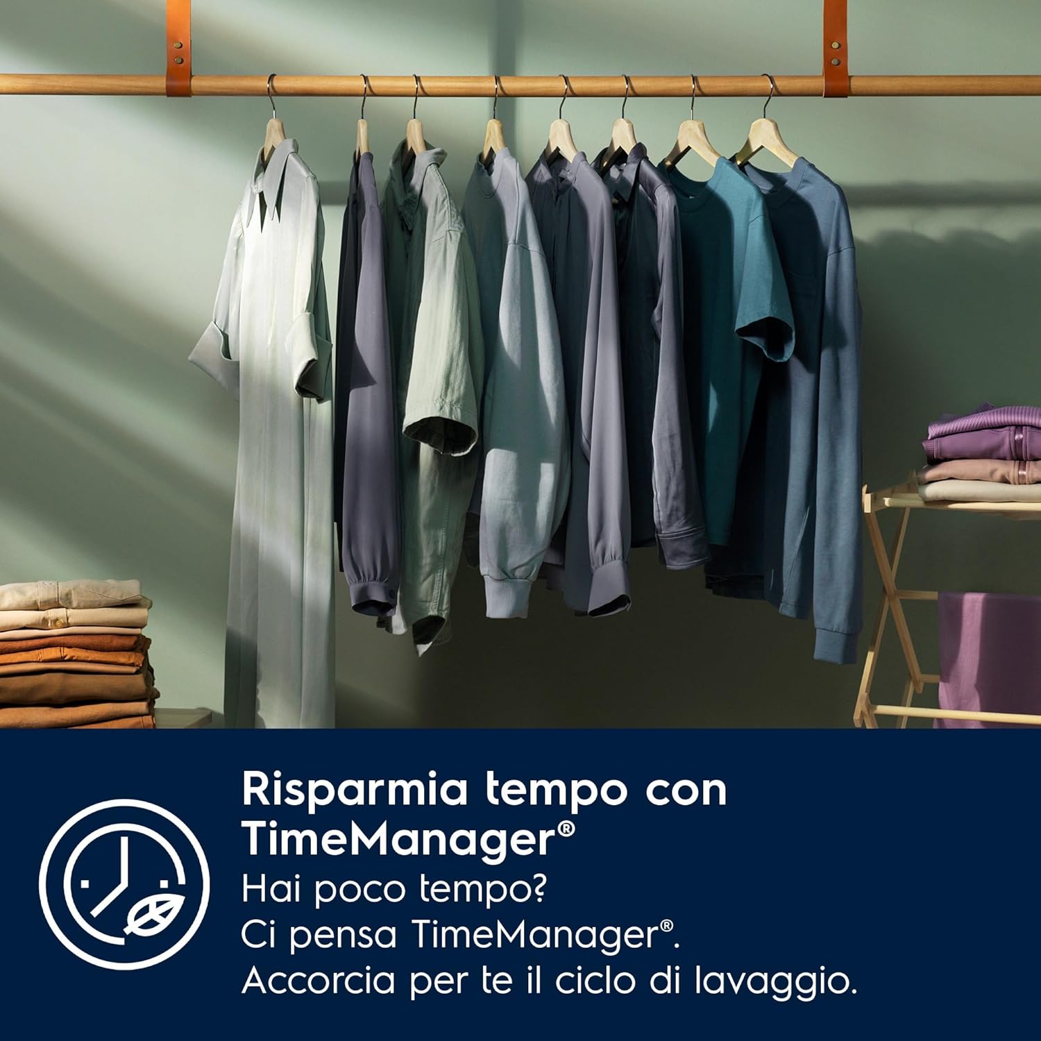 Lavatrice standard EW5F8W a libera installazione con capacità 8 kg. Riduci la durata dei cicli di lavaggio in base alle tue esigenze. Basta selezionare la funzione TimeManager sul pannello per ridurre la durata del ciclo. Ottimi risultati di lavaggio proprio quando vuoi tu. La funzione AutoSense si adatta alle tue esigenze per un cura ottimale dei tessuti. Questa funzione regola il tempo di lavaggio, così come il consumo energetico e idrico in base al volume del carico. Per una cura completa del bucato senza spreco di risorse. Il programma Hygiene, certificato Swissatest, rimuovere più del 99,99% di batteri e virus dai vestiti. Mantenendo la temperatura di lavaggio sopra i 60°C, i vestiti risultano più igienici e puliti con riduzione degli allergeni. La funzione partenza ritardata ti consente di posticipare l'orario di avvio del ciclo di lavaggio da 1 a 20 ore, per evitare che i capi puliti rimangano nel cestello per ore. Questa lavatrice è dotata del cesto GentleCare, progettato appositamente per prendersi cura dei tuoi capi. Il nostro cestello riduce la deformazione dei tessuti durante il lavaggio e la centrifuga. Classe energetica: A. Dimensioni (AxLxP) : 847x596x547 mm. Colore: bianco.