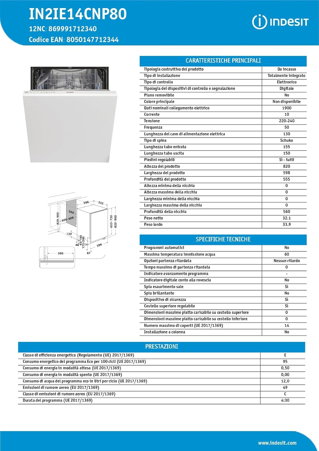 Indesit IN2IE14CNP80 Lavastoviglie A Scomparsa Totale, 60 Cm, 49 dBA, 14 Coperti, 5 Programmi, Lavaggio Fast&Clean 28 Minuti, Funzione Push&Go, Vasca In Acciaio Inox, Classe Energetica E