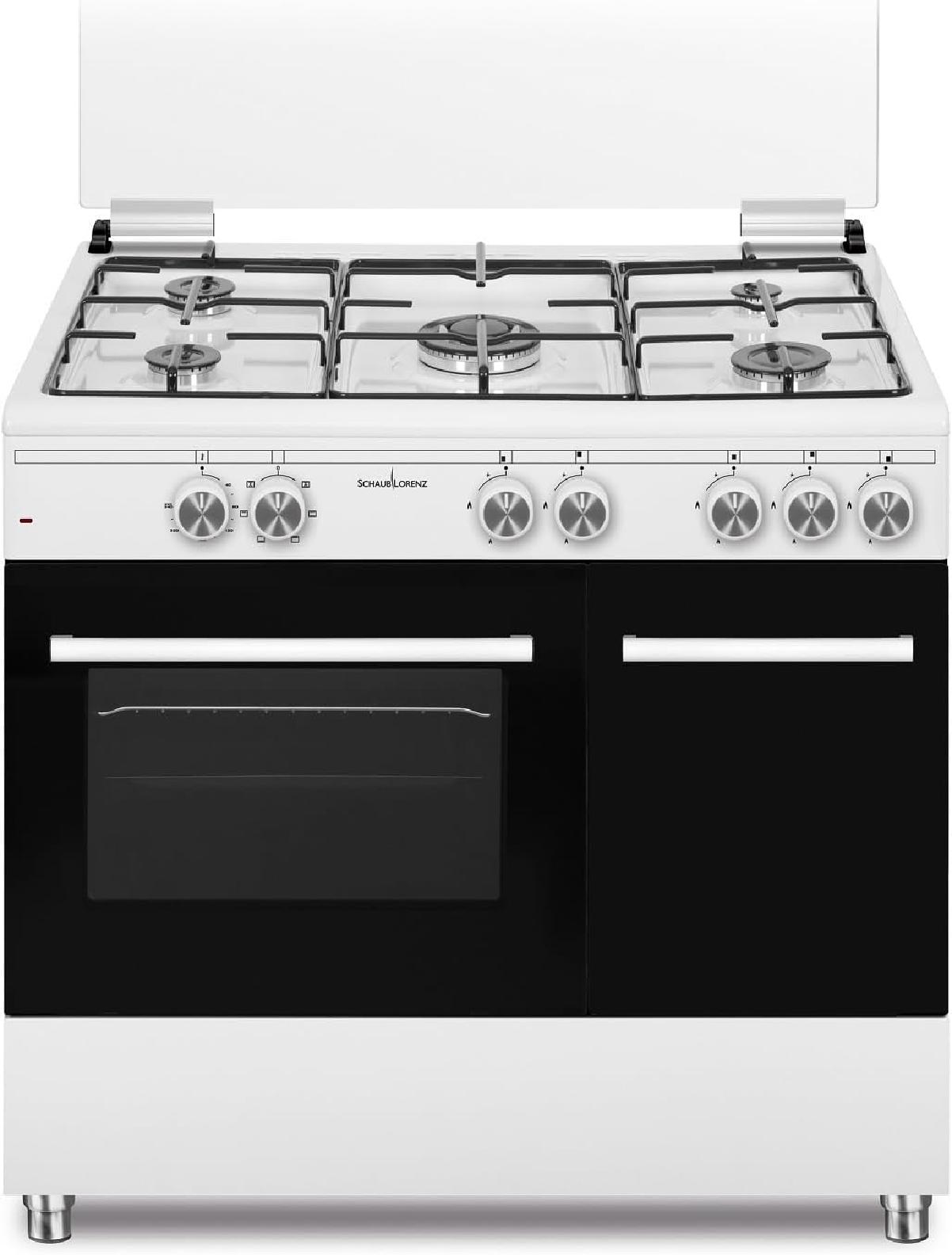 SCHAUB LORENZ SS590GEW. Cucina 90 x 60 cm - Libera installazione - Forno A gas - Grill elettrico - 5 fuochi a gas con dispositivo di sicurezza - Accensione elettronica sottomanopola - Cavità smaltata - 1 griglia forno - 1 vassoio forno - Luce forno - Coperchio in cristallo - Apertura vano sottoforno: ribaltina - Volume cavità forno: 59 litri - Dimensioni (A x L x P cm) 90 x 90 x 60 cm