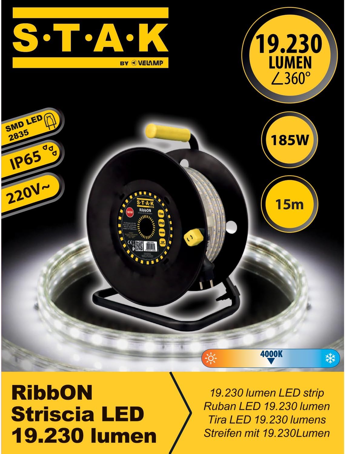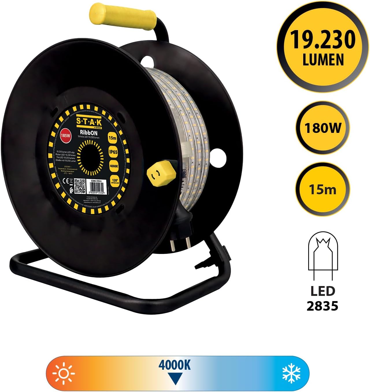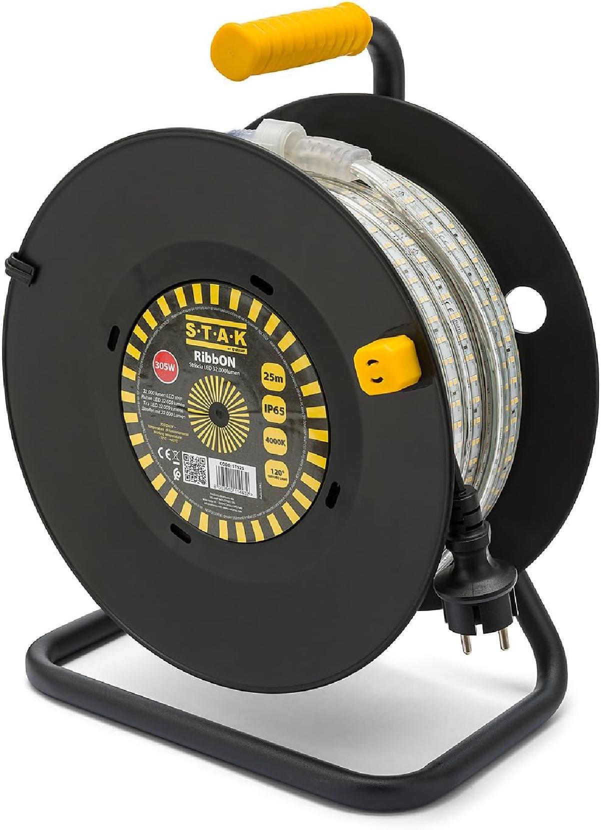 STAK RibbON Striscia LED 15 Metri con Avvolgitore – 19.230 Lumen, 4000K Luce Naturale, IP65, Flessibile e Impermeabile per Uso Professionale in Cantiere e Esterni