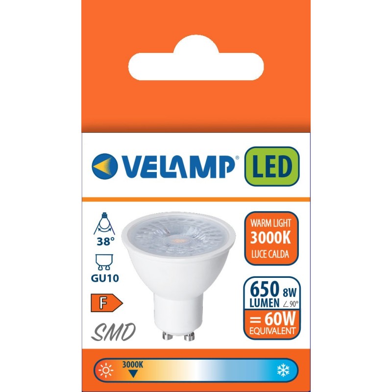 Velamp LB158-30K Lampadina LED SMD, attacco Spot GU10, 230 V, 8 W/650 lm, 3000 K, fascio luminoso 38 gradi ( Scatola da 200 Faretti )